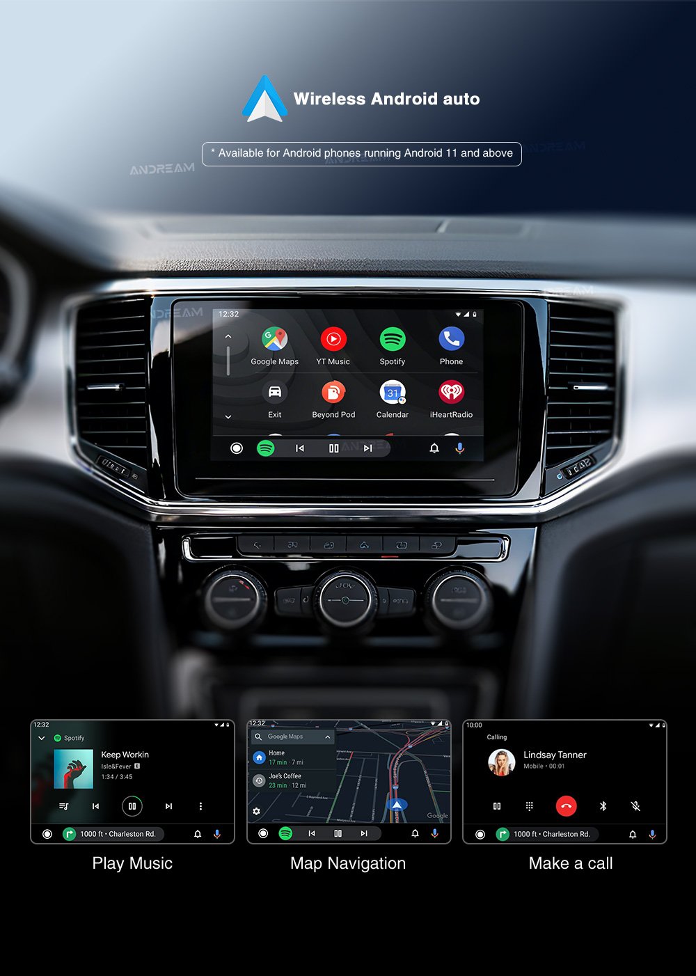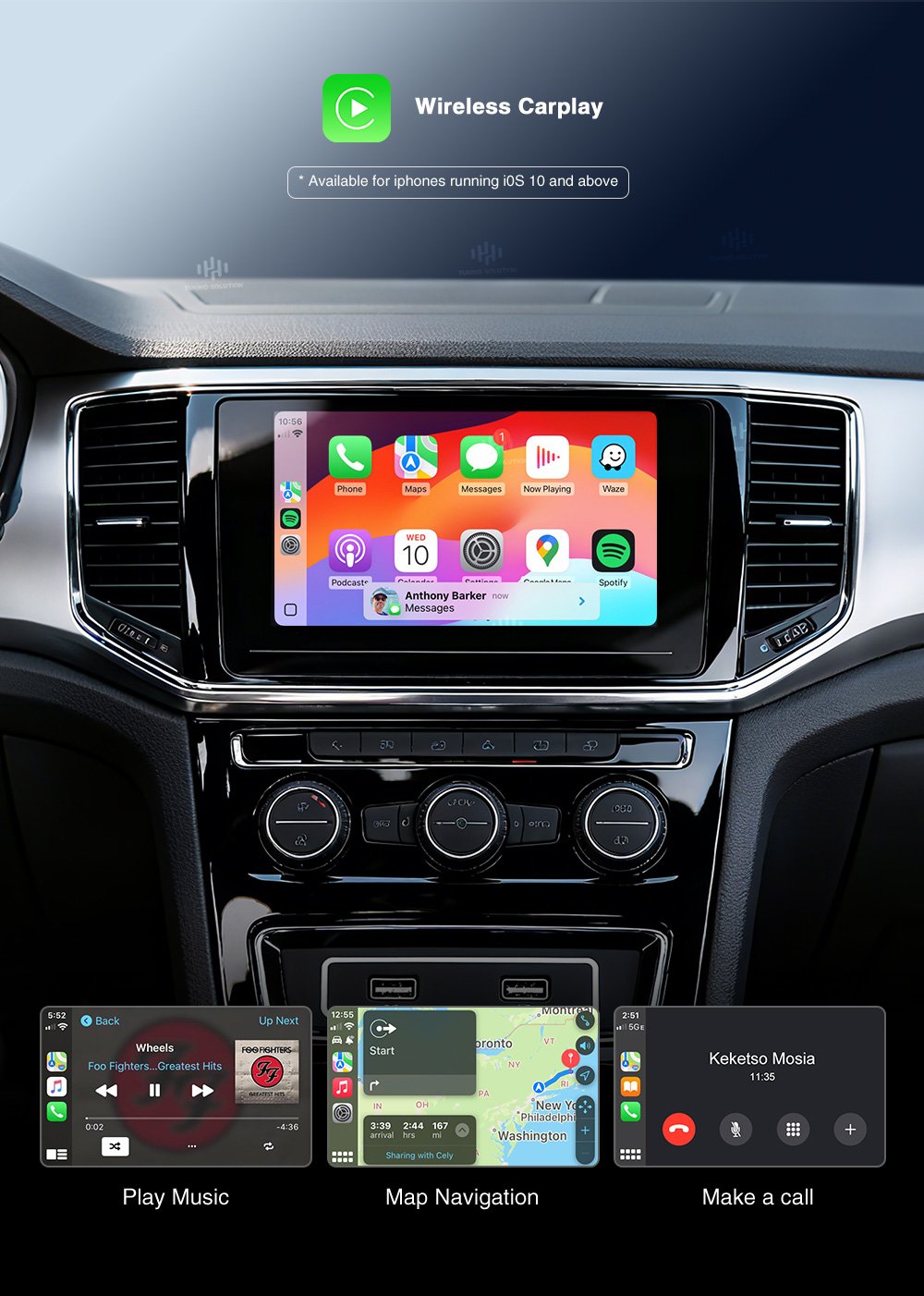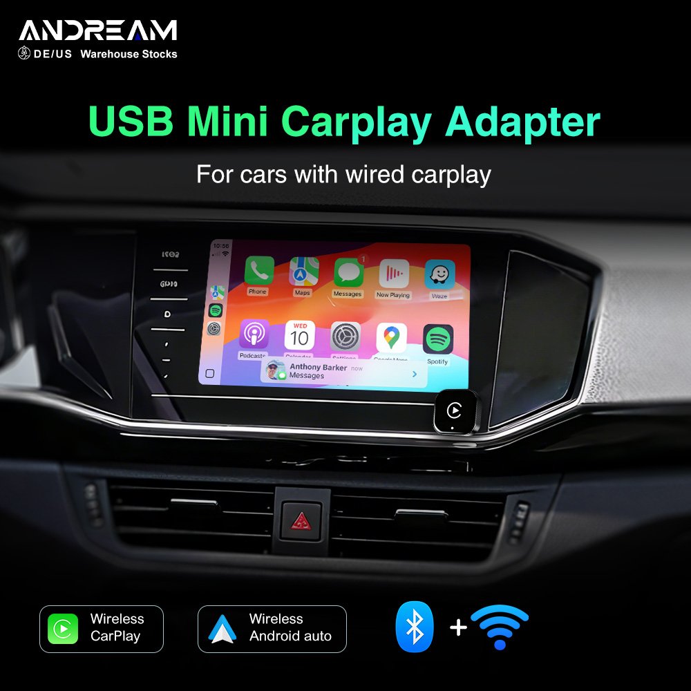 Is a compact, two-in-one wireless adapter that seamlessly supports both CarPlay and Android Auto. Plug in via USB-A (adapter included for USB-C). Smaller than a flash drive, it hides discreetly in your car while delivering fast boot times, smooth touch controls, and lag-free navigation.