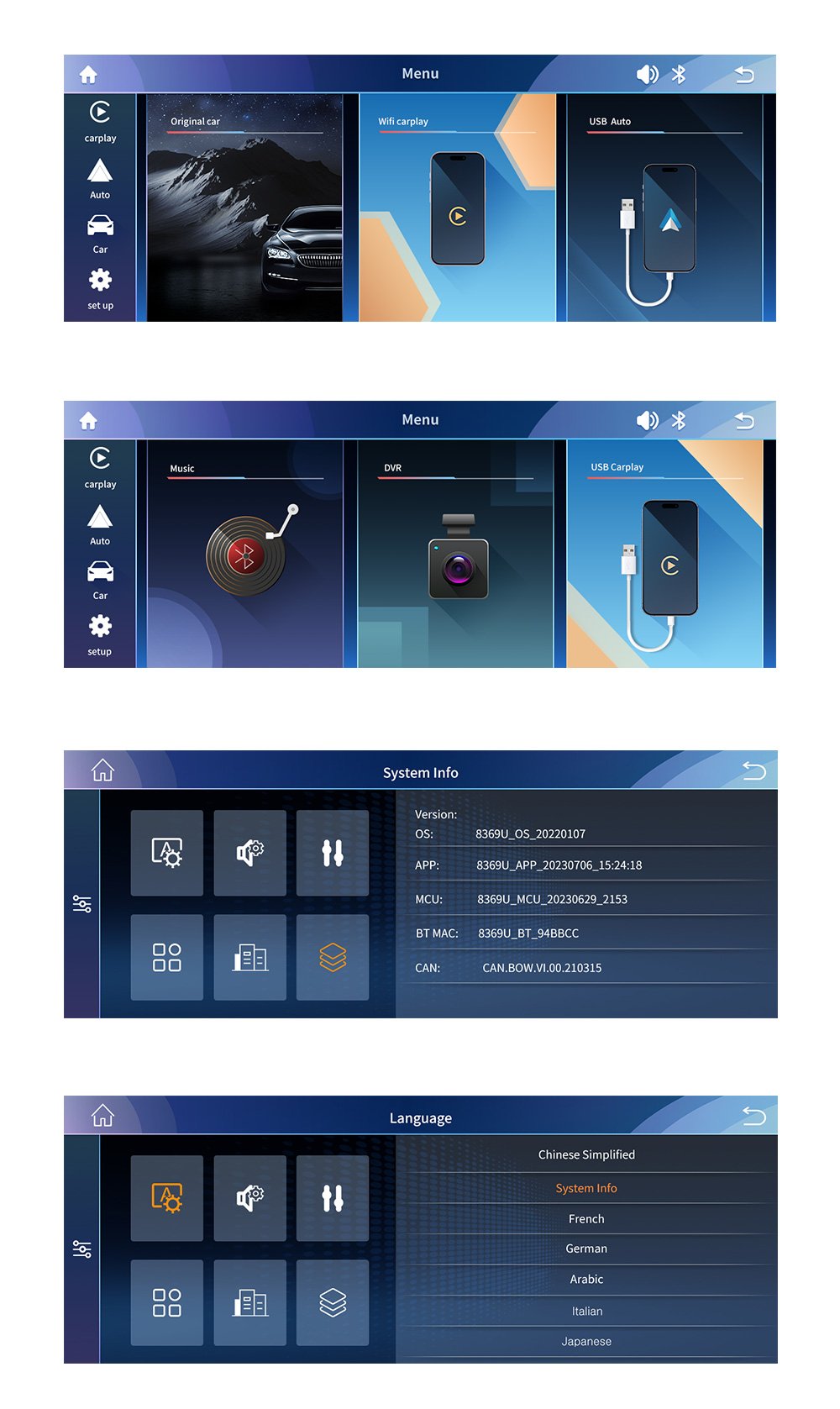 You can easily switch back and forth between the CarPlay/Android-auto and your original head unit. (TIPS: Press and hold the “Menu” key to switch the system)